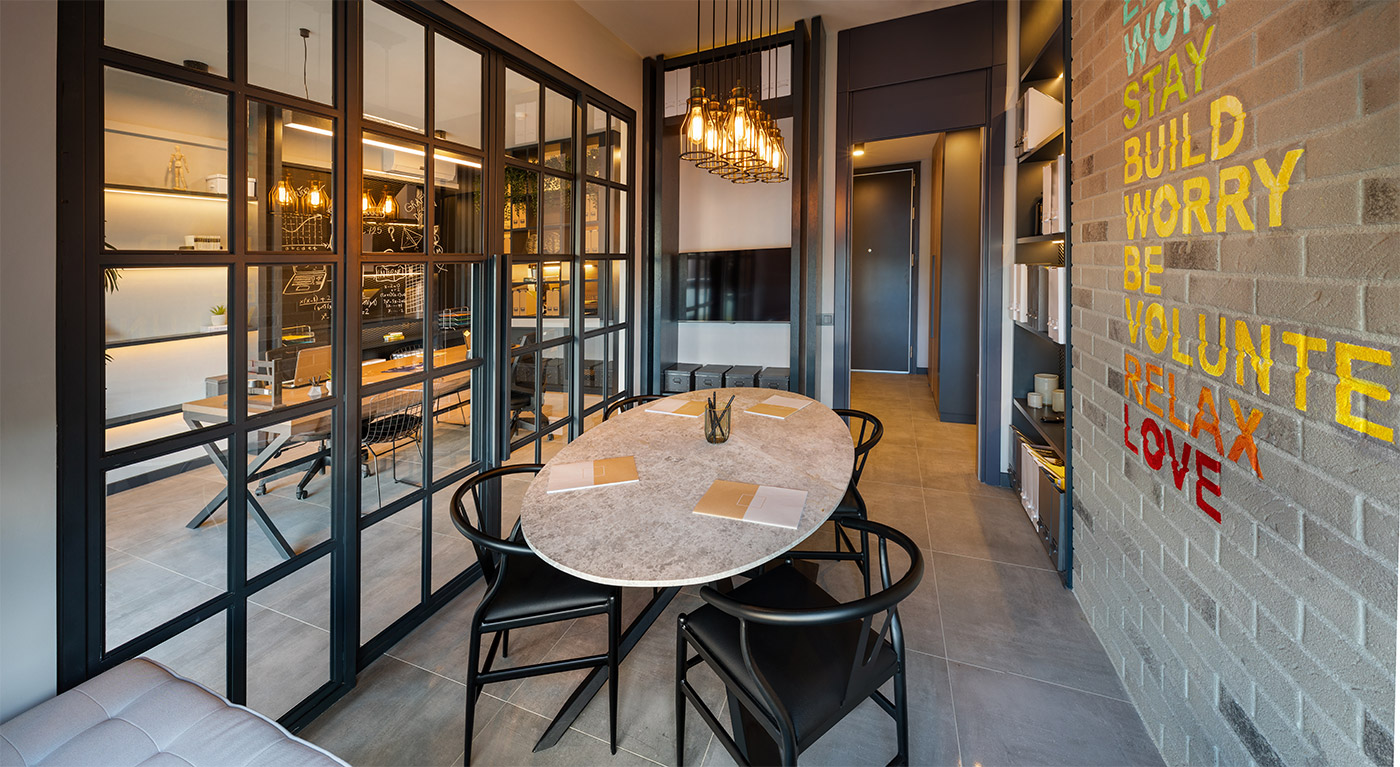 Toplantılar da değişti. Kapılar ardında zamanın durduğu değil ofisteki tüm hareketi algılandığı ama gerekli sessizliğin sağlandığı bir mekan olarak tasarladık toplantı odasını. Geniş camlı kapı ile çalışma mekanından ayrılan mekan aynı çalışma mekanı gibi yere kadar doğramalar sayesinde bol ışıklı ve havadar.